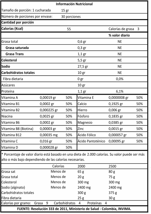 - Vitaminas y minerales: 50% del valor diario recomendado