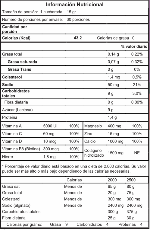 Dosis recomendada: 1 cucharada (15g) diaria, mezclada con agua, jugo o la bebida de tu preferencia. Se recomienda consumir preferiblemente en ayunas para mejor absorción.