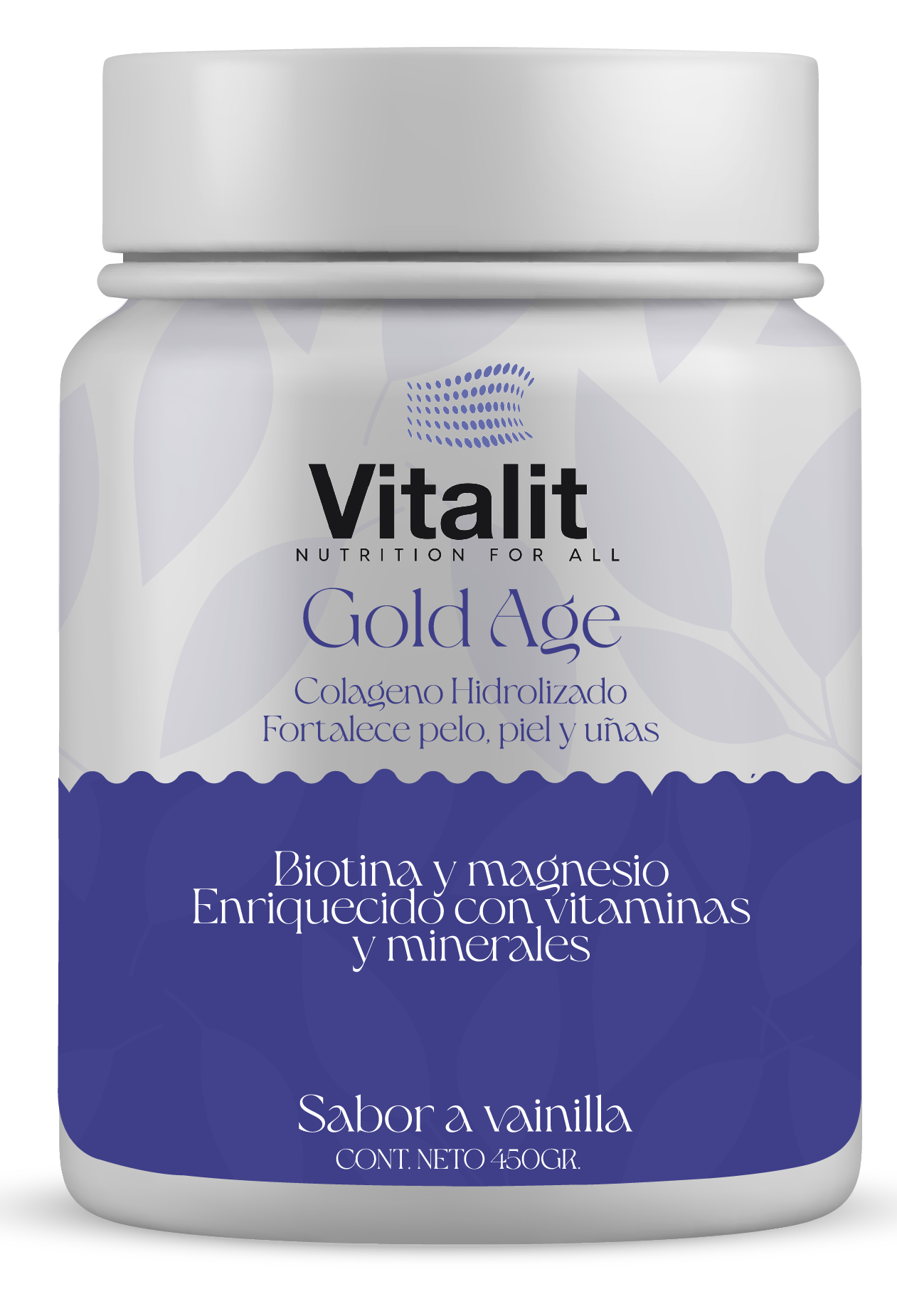 Vitalit Gold Age es un suplemento nutricional premium con colágeno hidrolizado especialmente formulado para fortalecer piel, cabello y uñas. Esta fórmula avanzada combina colágeno de alta absorción con biotina, magnesio y un complejo completo de vitaminas y minerales, con un delicioso sabor a vainilla para mantener tu belleza natural desde adentro.